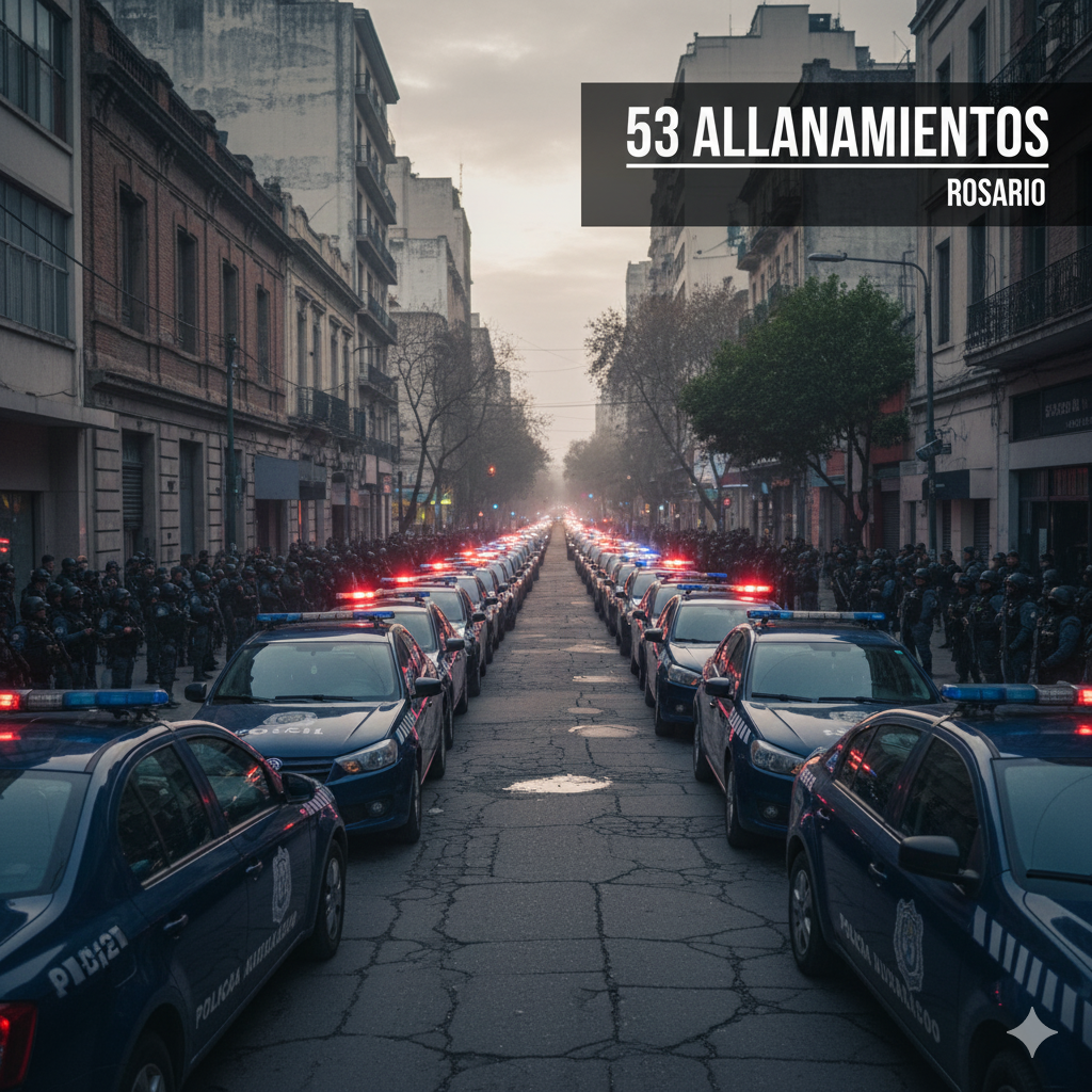 Megaoperativo policial en Rosario con 500 efectivos y 53 allanamientos tras escalada de violencia. Conoce resultados, armas incautadas y el impacto real.
